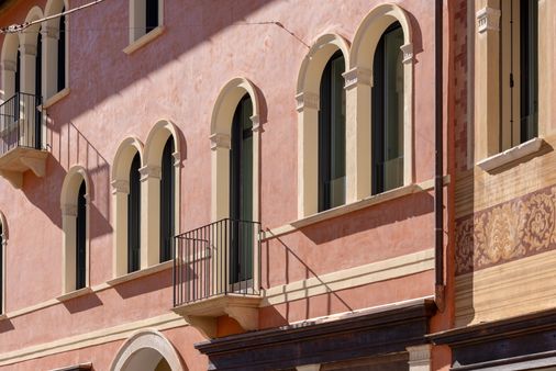 Il restauro ha valorizzato le cromie calde dell’intonaco e i dettagli ornamentali, riportando alla luce l’equilibrio proporzionale delle bucature e la relazione armonica tra pieni e vuoti. L’intervento si inserisce con discrezione nel tessuto urbano, rafforzando l’identità del fronte strada e contribuendo alla qualità complessiva dello spazio pubblico.