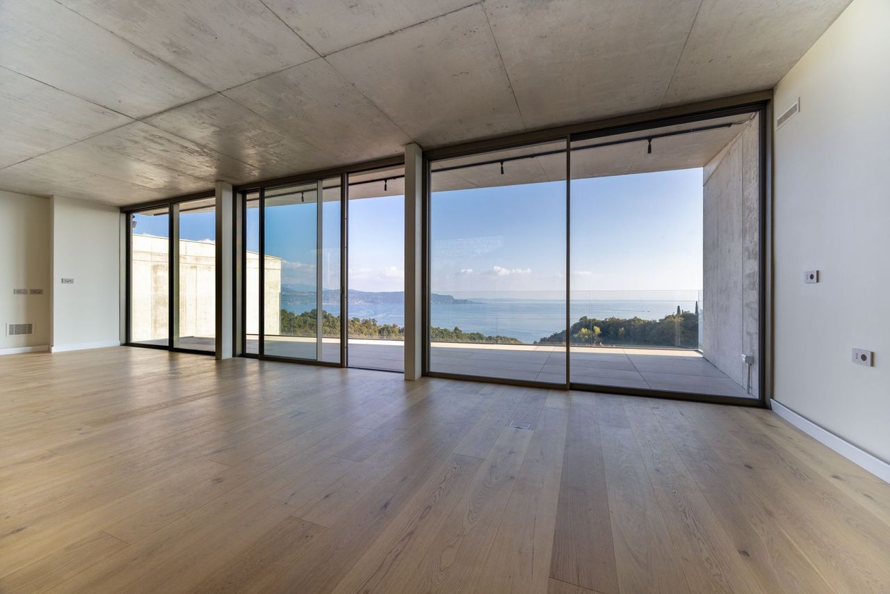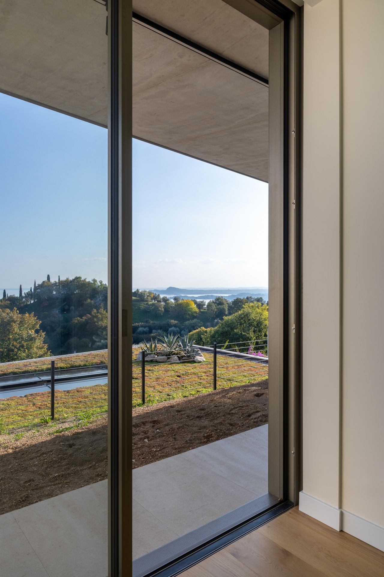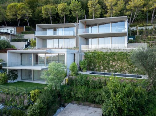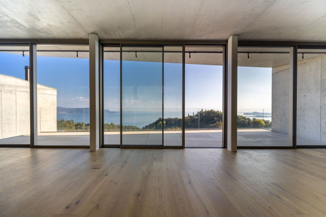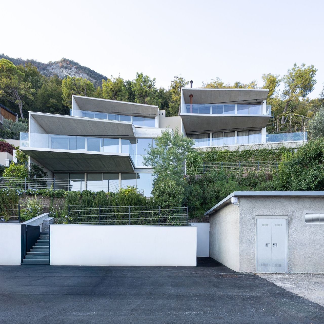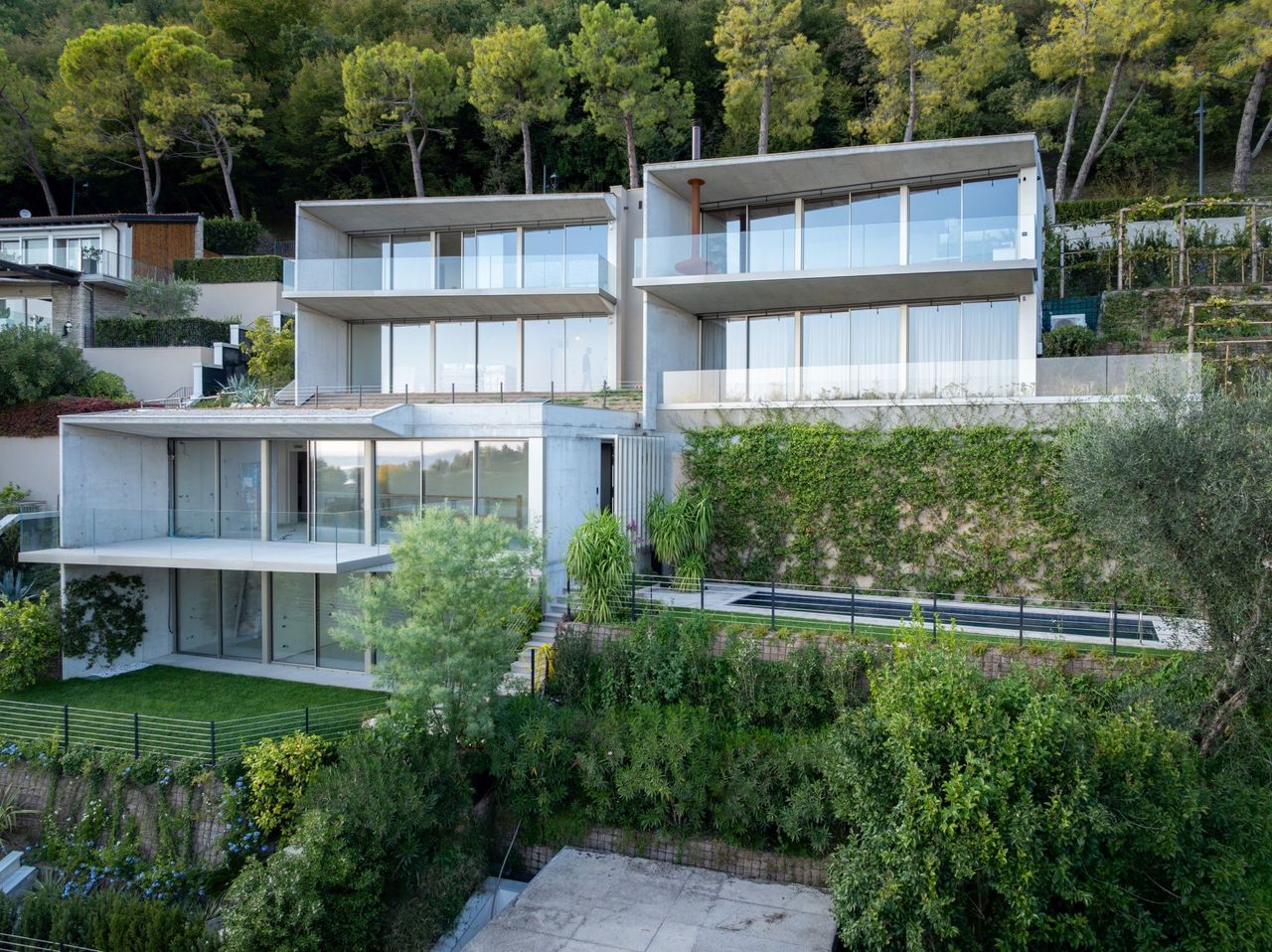 Immerso nel verde delle colline che si affacciano sul lago, Ville Sul Garda, realizzato insieme all’impresa edile MP Engineering, è un progetto residenziale contemporaneo che nasce da un dialogo diretto e costante con il contesto naturale. I volumi orizzontali, modellati sull’andamento del terreno, si adagiano lungo il pendio seguendone la morfologia e aprendosi verso il lago attraverso ampie terrazze e logge panoramiche. L’alternanza tra superfici in calcestruzzo a vista e grandi vetrate definisce un linguaggio architettonico essenziale, fatto di linee nette e aggetti profondi che incorniciano il paesaggio e ne amplificano la percezione.