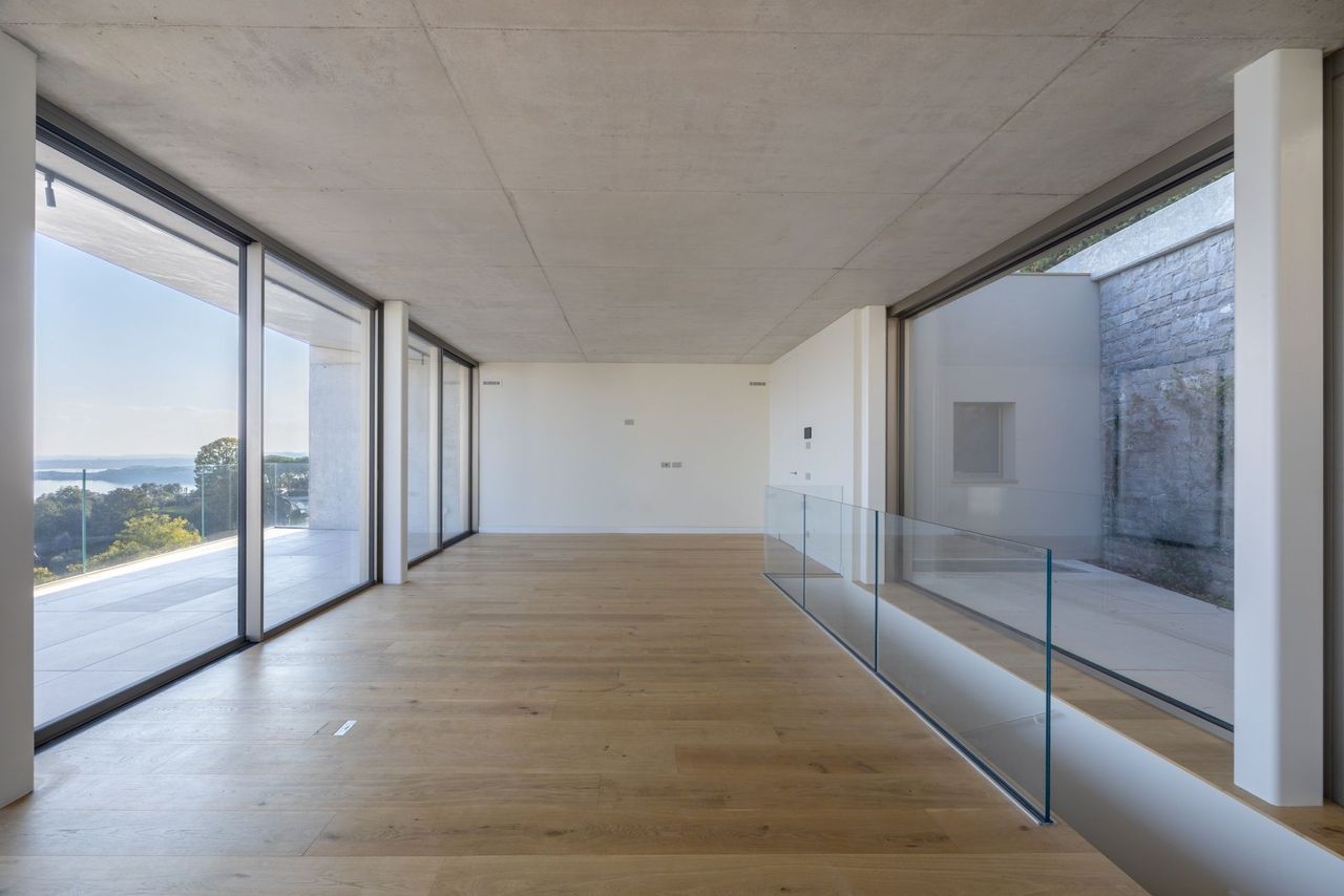 Il progetto paesaggistico accompagna l’architettura con discrezione, integrando giardini terrazzati e vegetazione mediterranea che mitigano i volumi e rafforzano il senso di continuità con l’intorno. All’interno, la matericità del legno naturale dialoga con il calcestruzzo a vista, costruendo un equilibrio raffinato tra rigore contemporaneo e calore domestico. Le zone giorno, ampia e fluida, si apre completamente verso l’esterno: le superfici trasparenti a tutta altezza permettono alla luce naturale di attraversare gli ambienti per l’intero arco della giornata, trasformando il panorama in una presenza costante e dinamica.